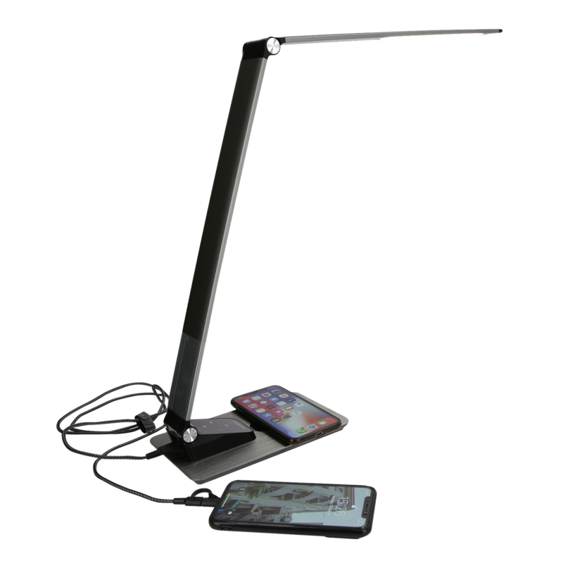 Beacon desk lamp, energy-saving LED white & warm lighting, wireless & USB charging, light dimming, adaptor included, size H420/L385/W120mm, black color