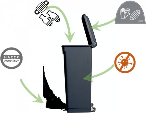 Container 45L black. Pedal Container with automatic closing of the lid. "Gloves, masks" sorting sticker included.