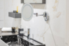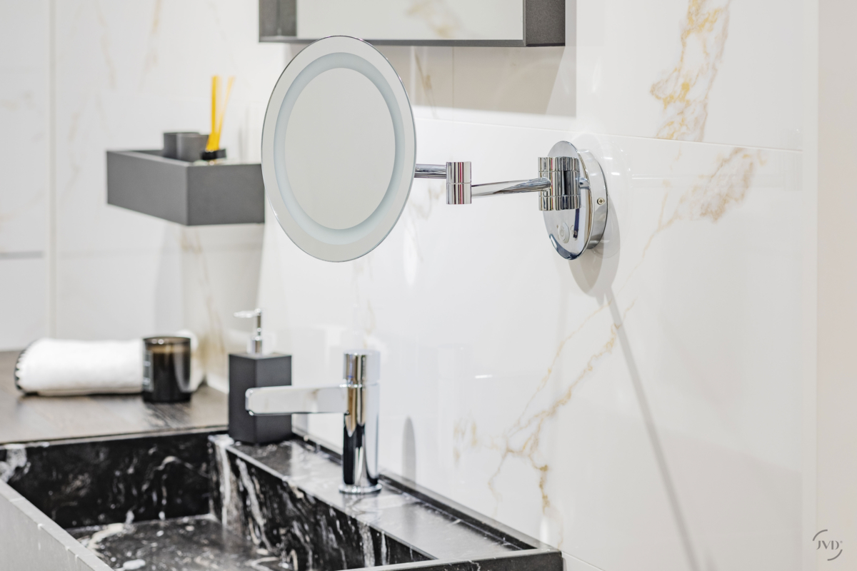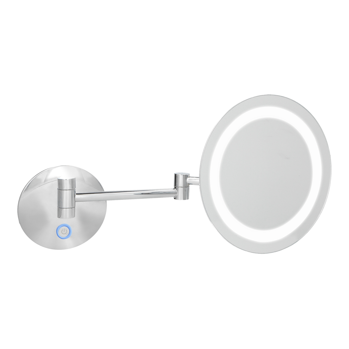 Celeste illuminated round mirror with tubular chrome brass arm with 2 lighting options: warm or cold white