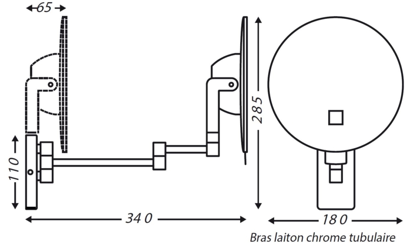 Round illuminated ECLIPS mirror with tubular arm with magnifying vision x3. Works with 1 supplied 3.6v lithium battery and allows installation without electrical connection. The mirror is equipped with a time delay of 3 min. Tubular chromed brass arm, 3 joints. Switching on by sensory system.