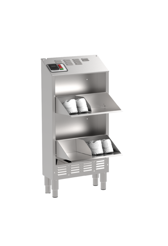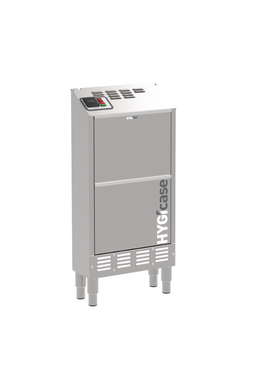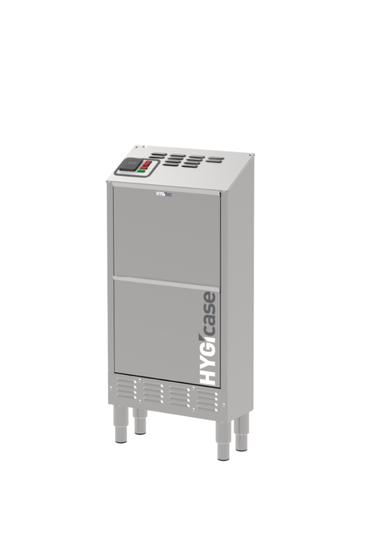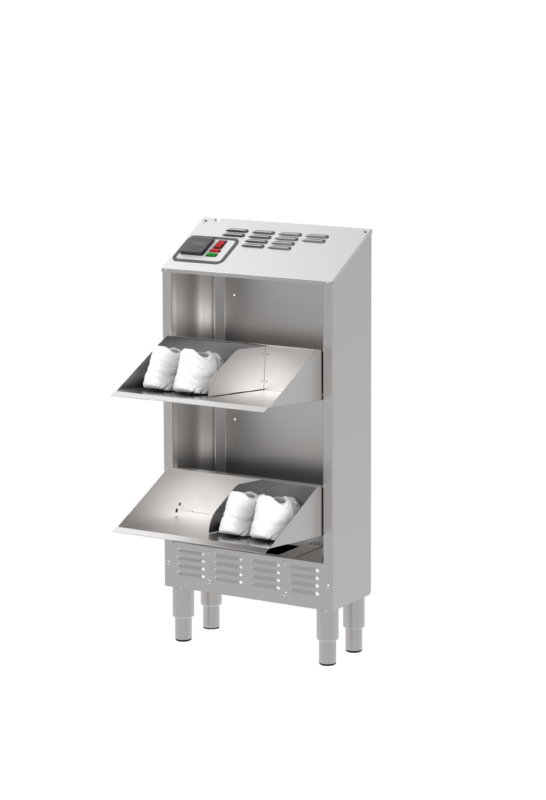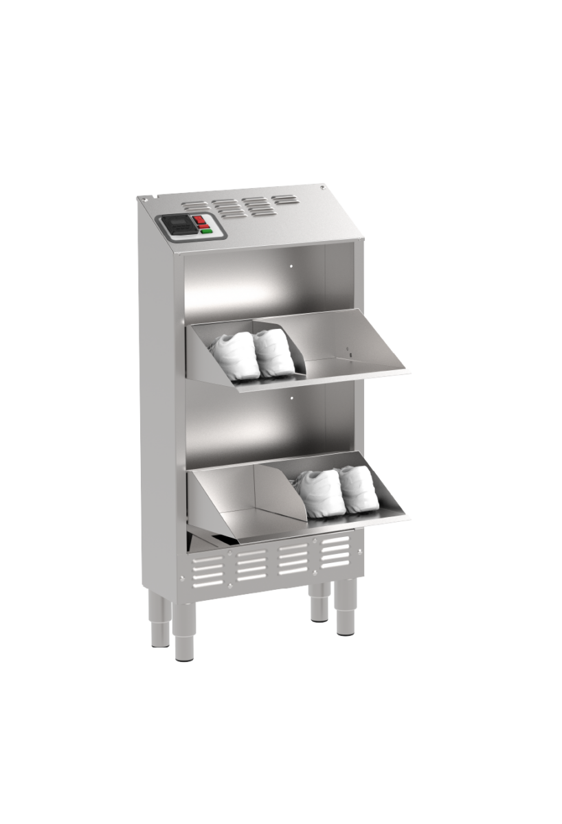 Compact and made entirely of stainless steel, HYGIcase cares for 4 pairs of low shoes through rapid drying, effective disinfection, and deodorization without chemicals. Its technology eliminates microorganisms both inside and outside the shoes. With an ultra-optimized design, it takes up minimal space — only 20 cm deep.