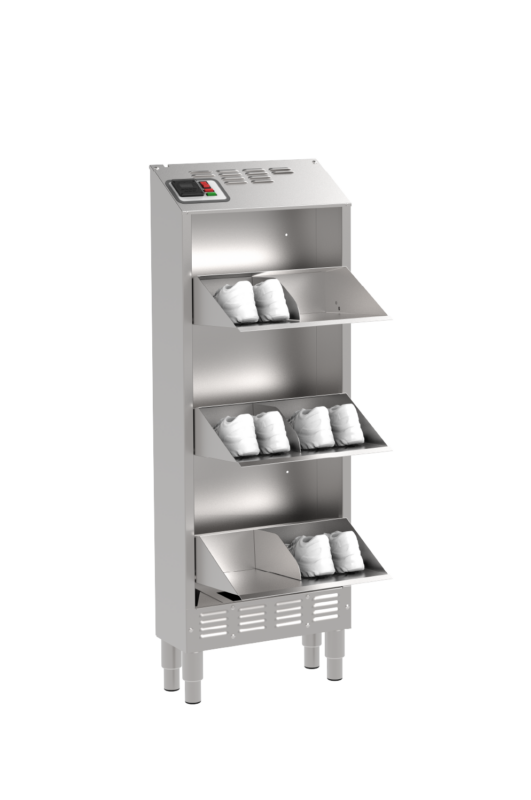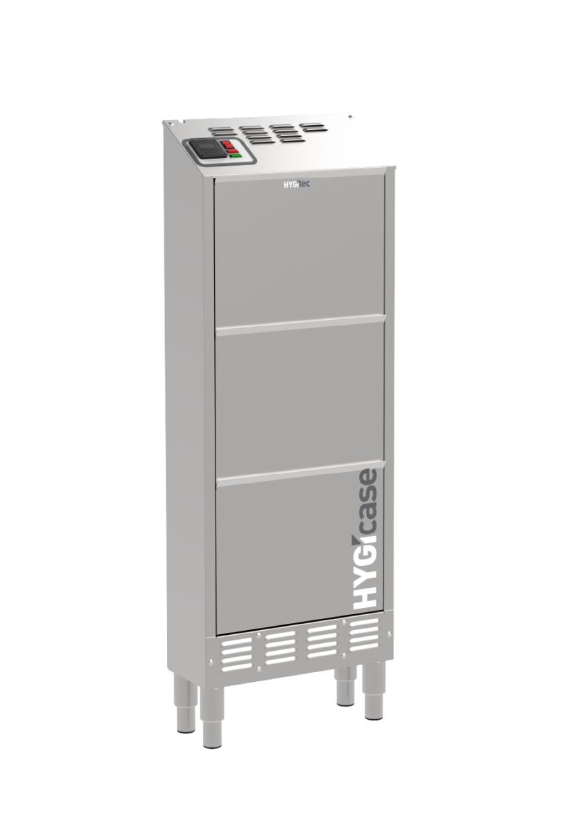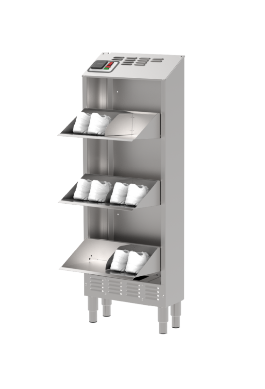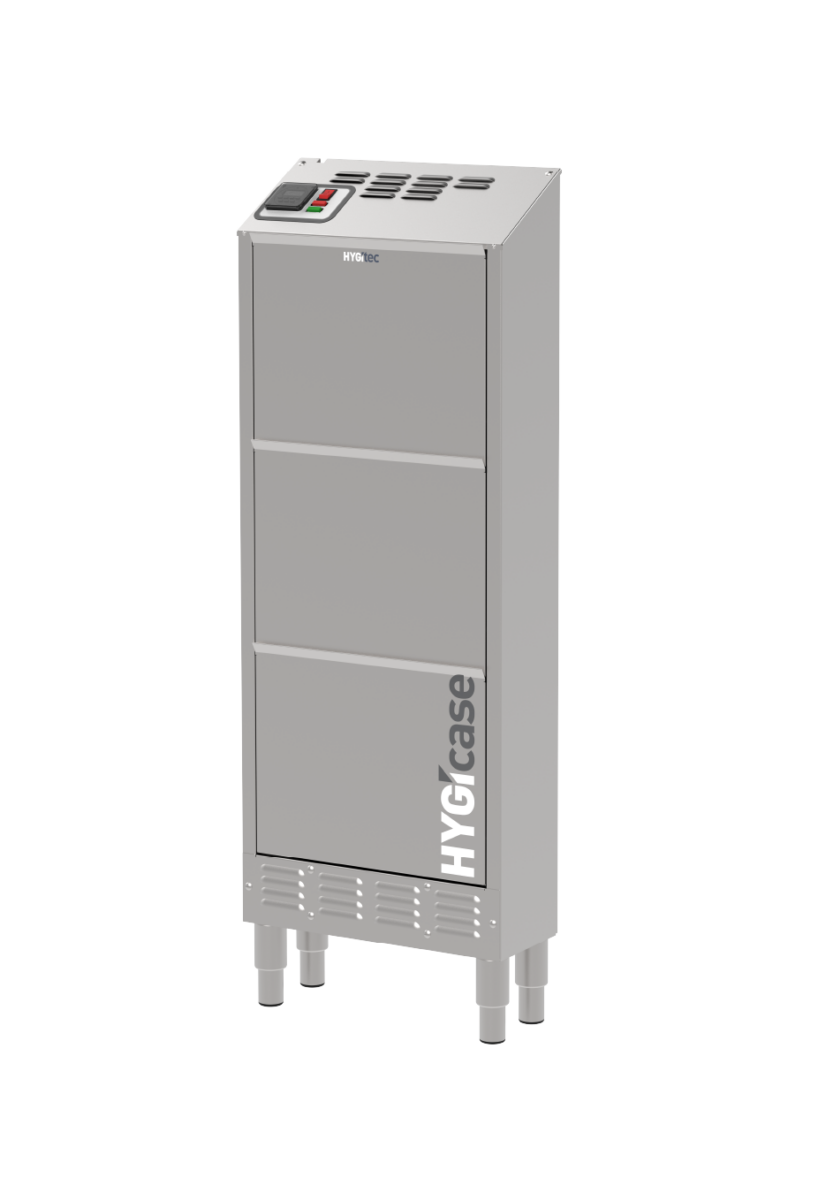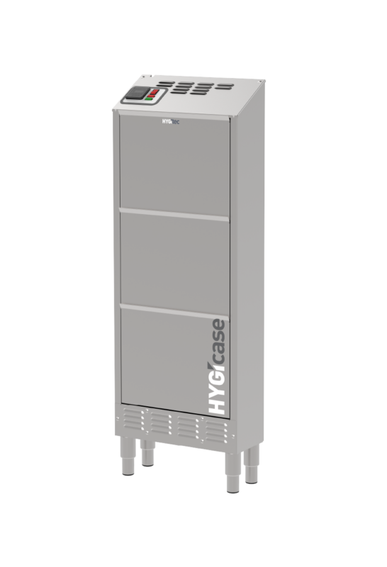 Compact and made entirely of stainless steel, HYGIcase cares for 6 pairs of low shoes through rapid drying, effective disinfection, and deodorization without chemicals. Its technology eliminates microorganisms both inside and outside the shoes. With an ultra-optimized design, it takes up minimal space — only 20 cm deep.