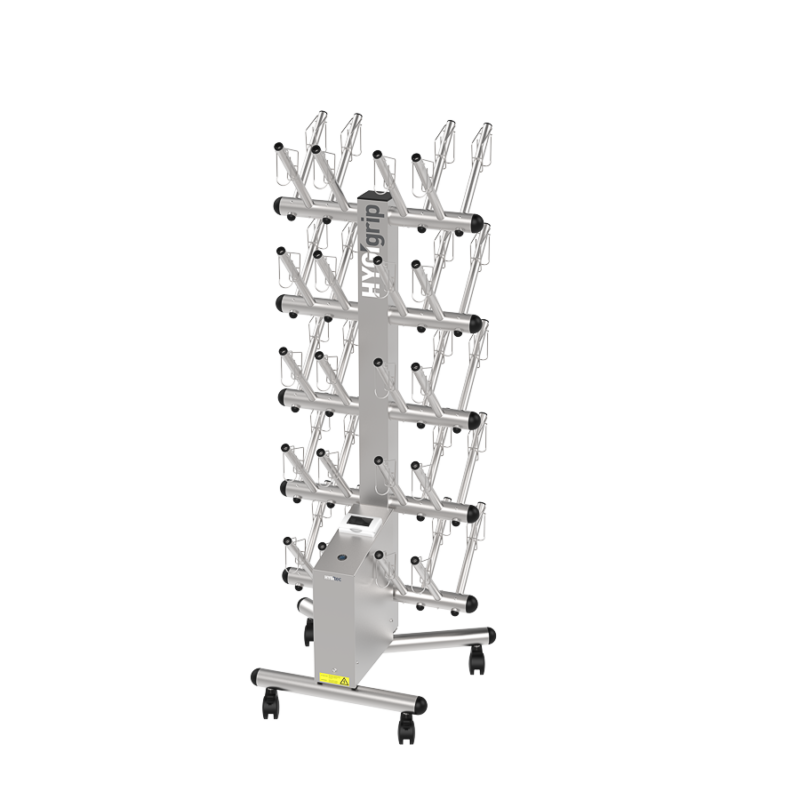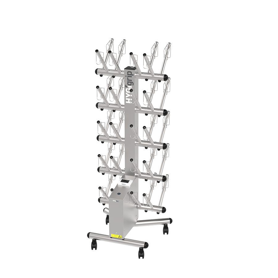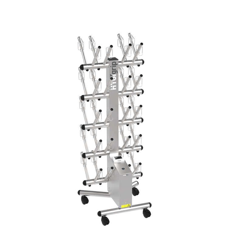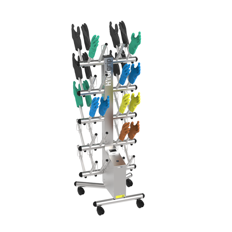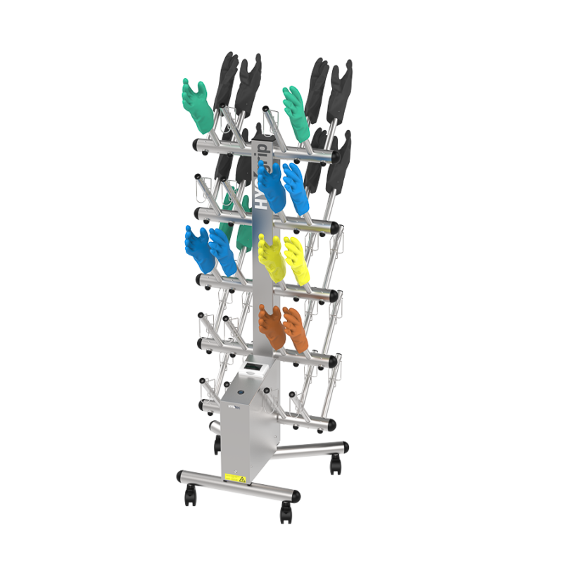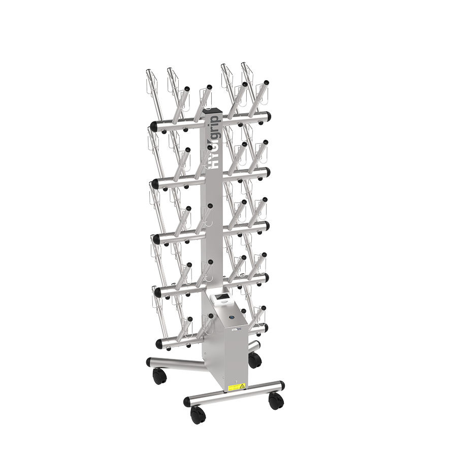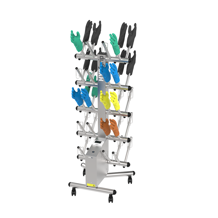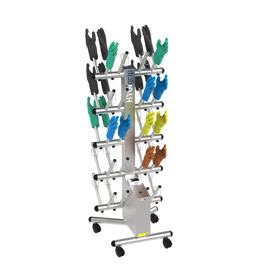 HYGIgrip glove dryer for 20 pairs, double-sided, made of 304L stainless steel. Disinfects all glove types without chemicals. Fitted with dedicated sleeves and 4 swivel wheels. Compact, durable, ideal for daily maintenance.