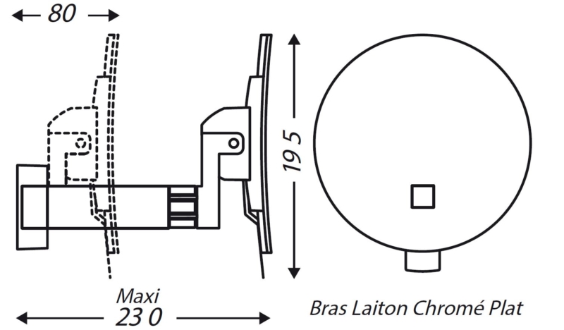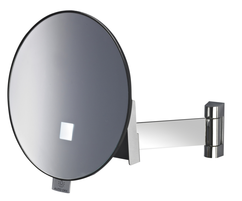 ECLIPS mirror round bright with flat arms with a magnifying vision x3. Works with 1 supplied 3.6v lithium battery and allows installation without electrical connection. The mirror is equipped with a time delay of 3 min. Flat chrome brass arm, 3 joints. Switching on by sensory system.