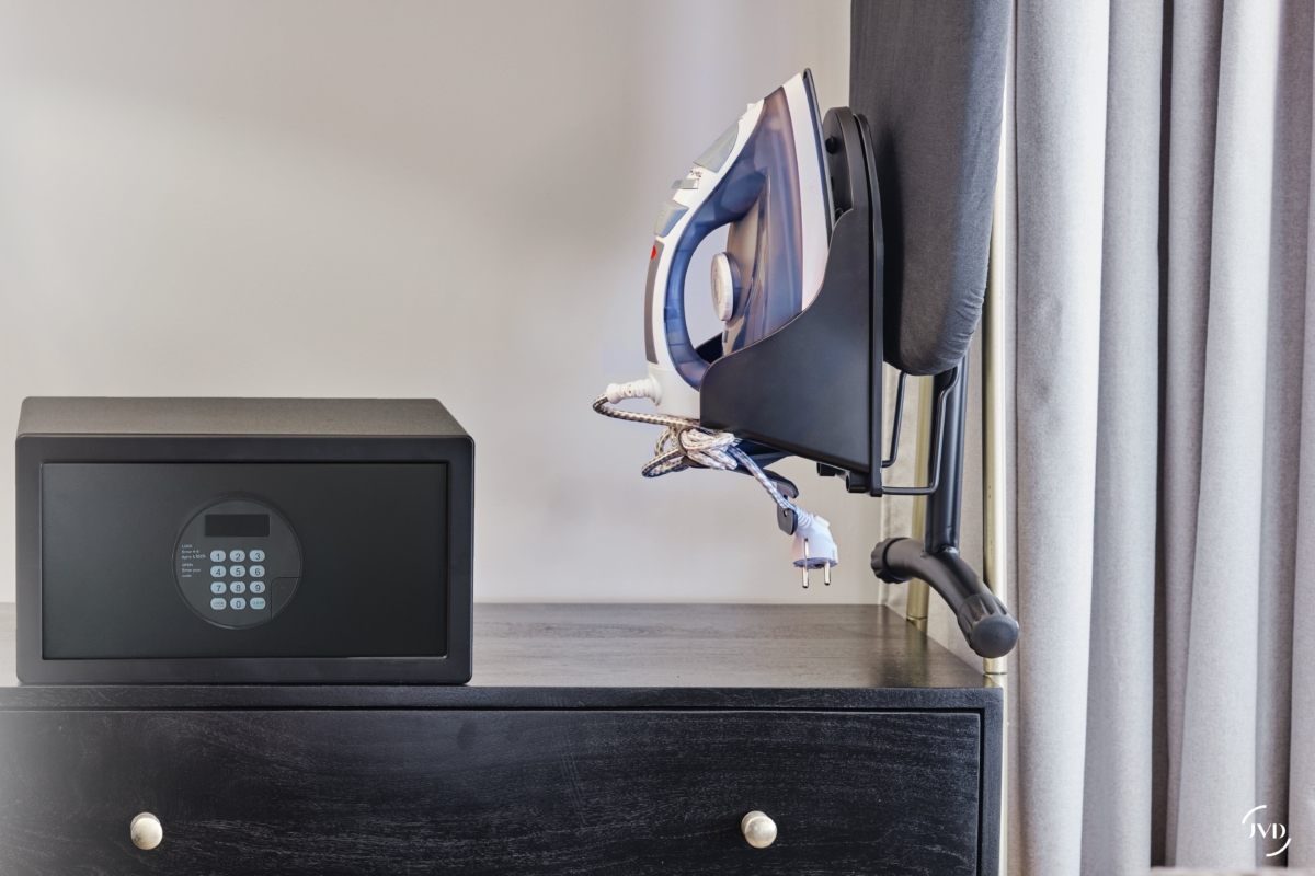 Ironguard, heavy-duty ABS, with heat-resistant buttons, hold iron securely, handy cord-wrap, H365/W141/D170mm, suitable for Vinci & Vivo irons, complete with board hanger, black