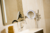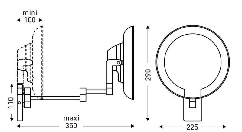 Luminous Cosmos mirror with tubular arm with magnifying vision x5. Works with 1 supplied 3.6v lithium battery and allows installation without electrical connection. The mirror is equipped with a time delay of 3 min. Flat chrome brass arm, 4 joints. Switching on by sensory system.