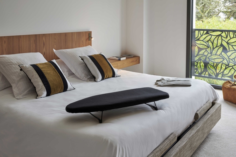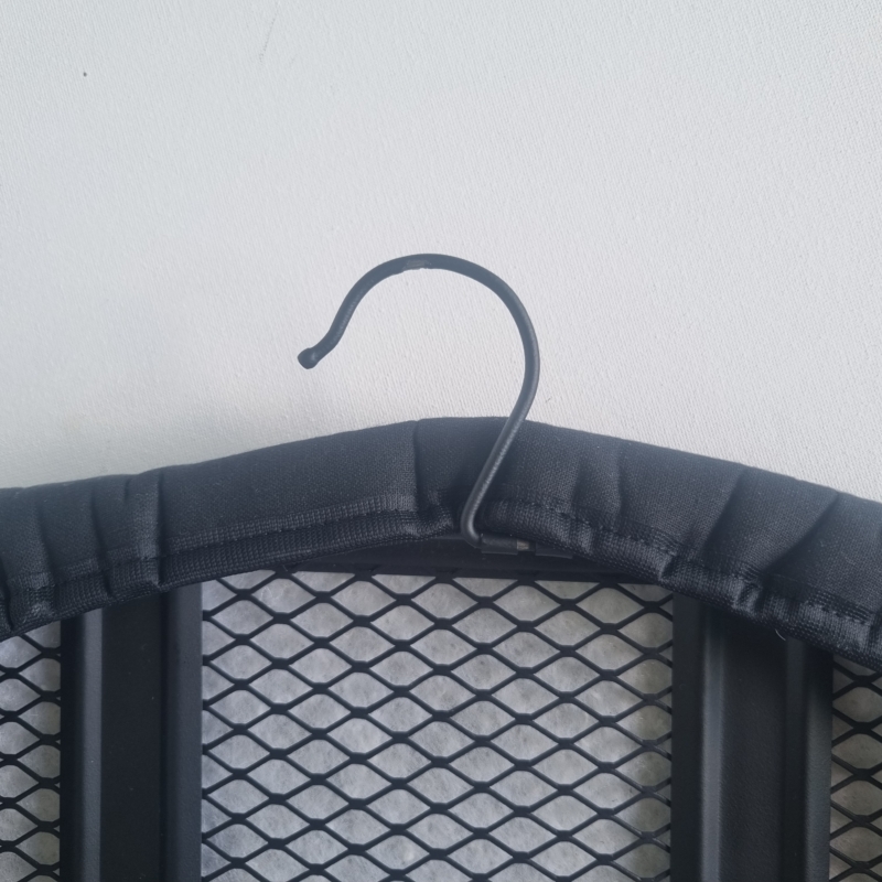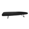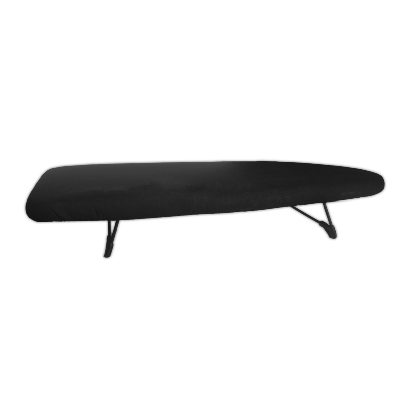 Mini ironing board, easy to use and store thanks to its integrated hook. It is covered with a black cover.