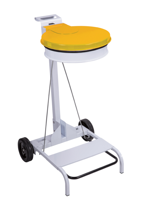 White mobile round bag holder with yellow lid. Large pedal for easy opening. Also available in several colours for selective sorting.
