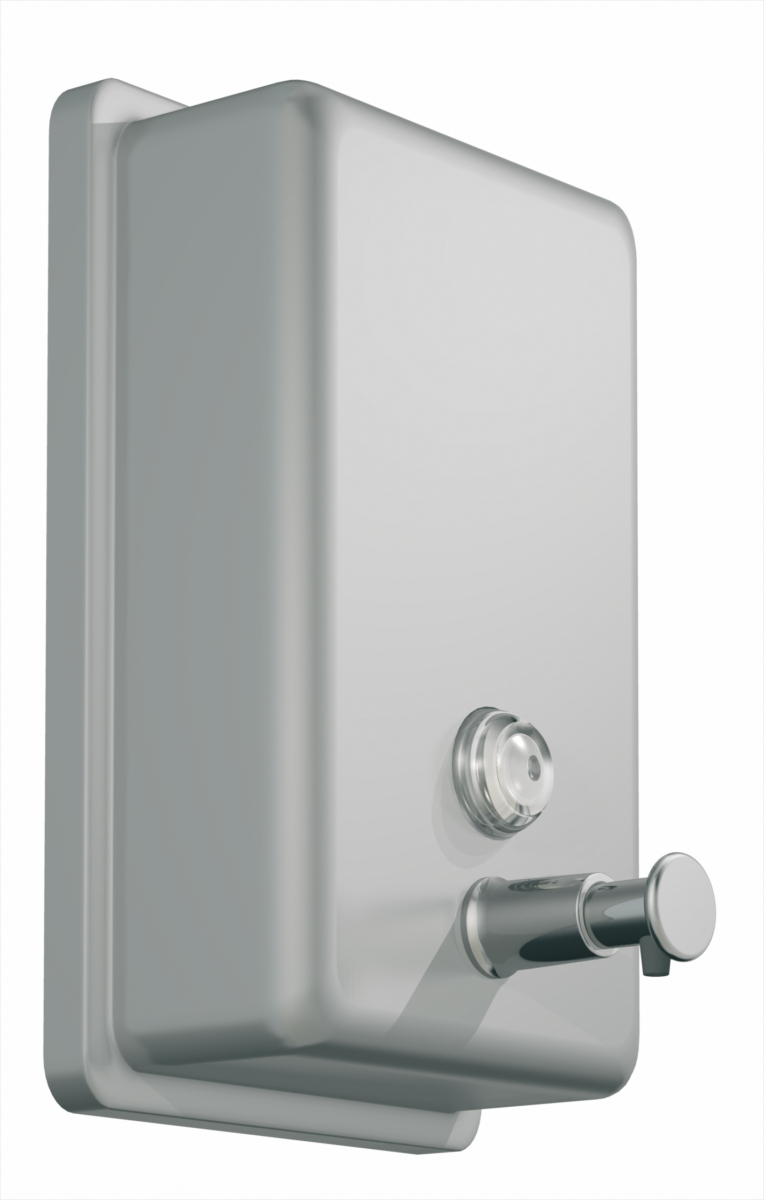 Savinox 700 ml brushed stainless steel soap dispenser. Vandal-resistant with key-operated cover lock and reinforced fastening system. Translucent level indicator.