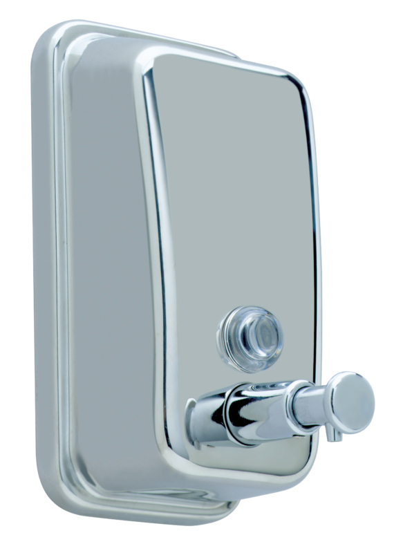 Savinox 400 ml shiny stainless steel soap dispenser. Vandal-resistant with key-operated cover lock and reinforced fastening system. Translucent level indicator.