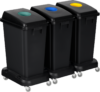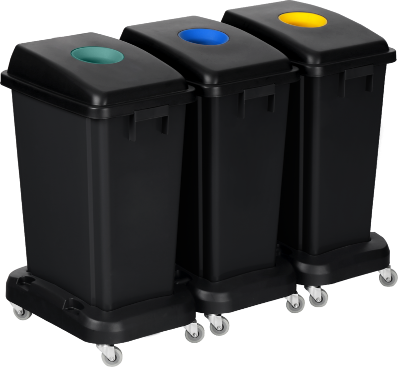 Set of 3 60L recycling bins. Round-opening lids in green, blue, and yellow. Trolley included for easy movement. Made of 100% recycled plastic.