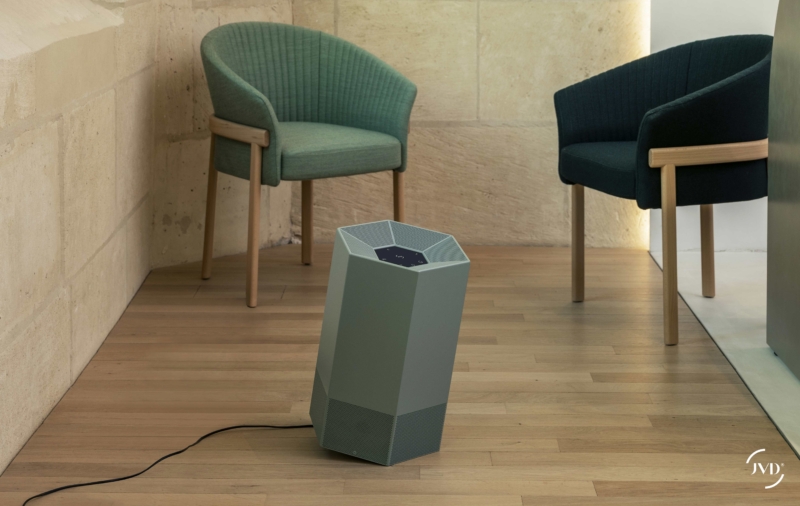 The Shield Malachite Green Professional Air Purifier, meticulously crafted in France and compliant with the NF B44-200 standard, covering a surface area of up to 60m².
