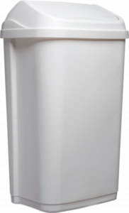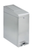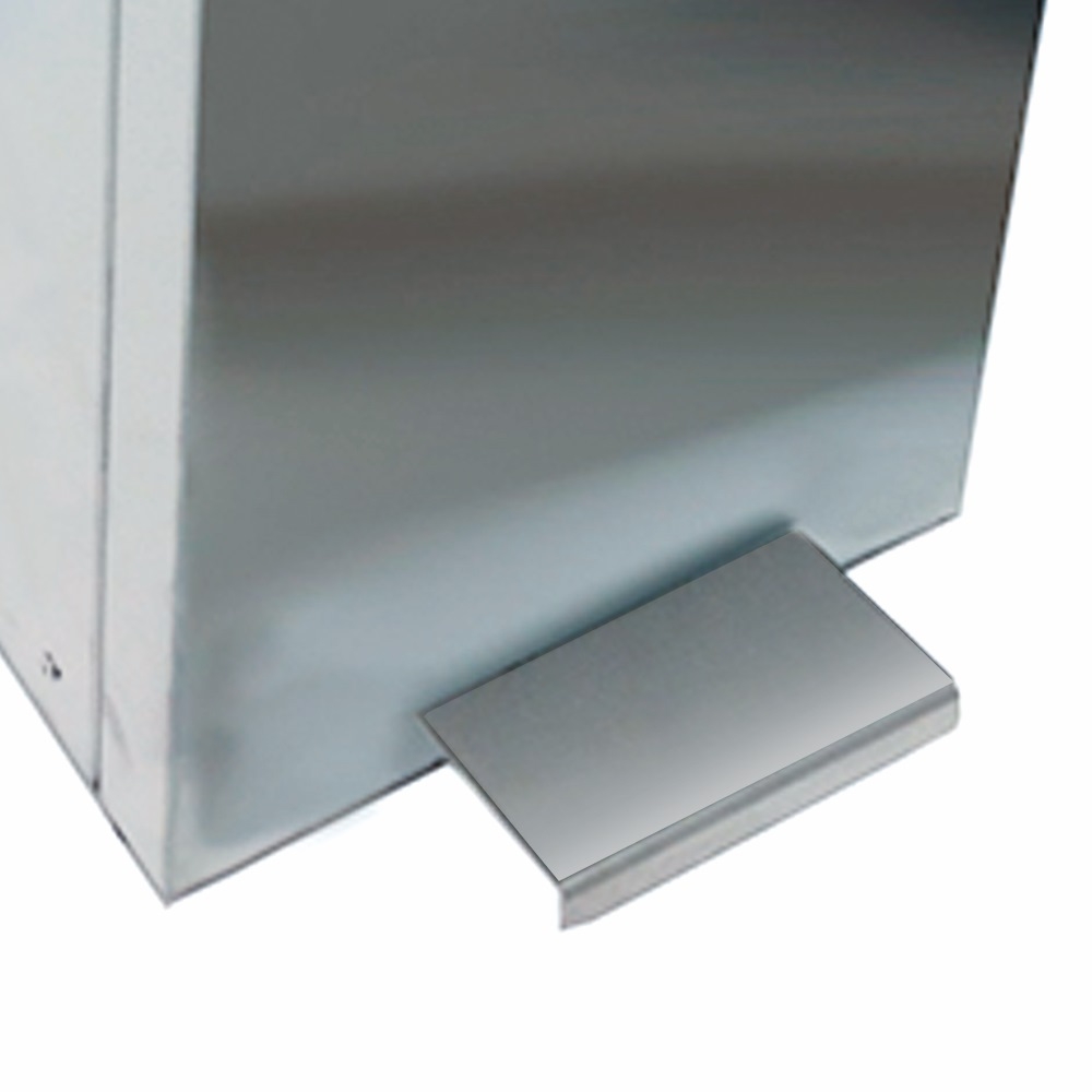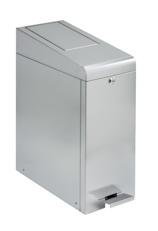 Large-capacity (45L) brushed 304 stainless steel feminine hygiene bin with pedal-operated trapdoor to conceal the interior.