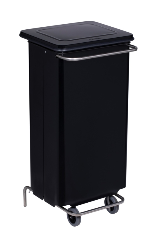 110L black mobile steel Container. Front opening for easy removal of waste bag.