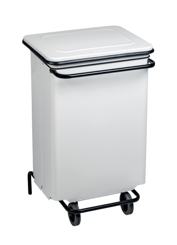 70L white mobile steel Container. Front opening for easy removal of waste bag.