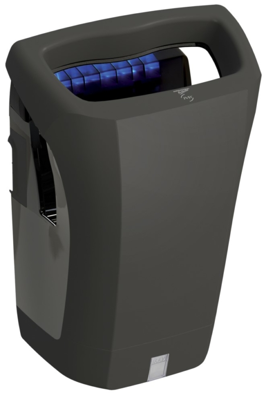 Stell'Air automatic Matt black hand dryer with forced air and bactericidal copper filter. Silent (73 dB) and anti-vandalism (IK10). Equipped with a water recovery tank or a direct evacuation solution (optional). 3 years warranty.