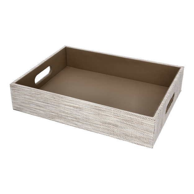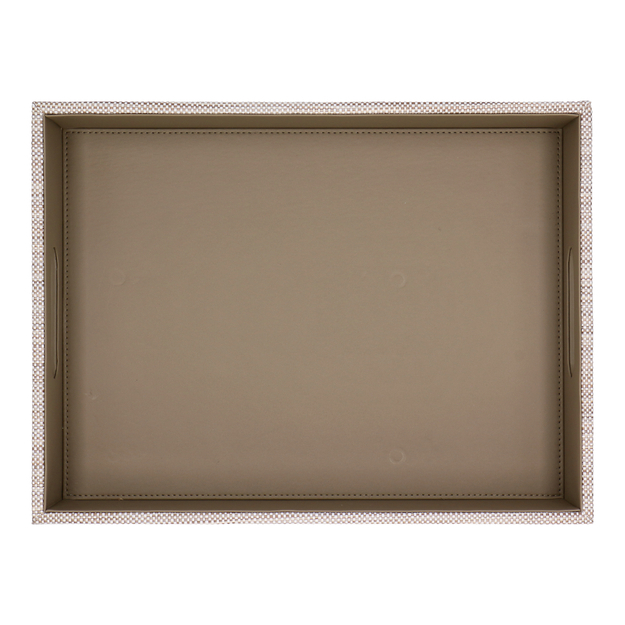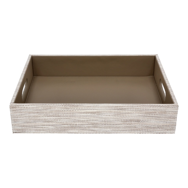 Tray with handles Adesign Tribe: refined design with an olive synthetic leather interior and woven grey-beige polypropylene exterior. Water-resistant and practical, it combines elegance and functionality for impeccable service.