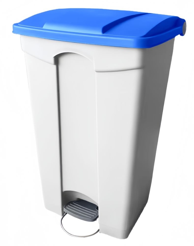 Container 90L white blue pedal cover with a stability ring and moving wheels. Automatic closure of the lid and selective sorting stickers included.